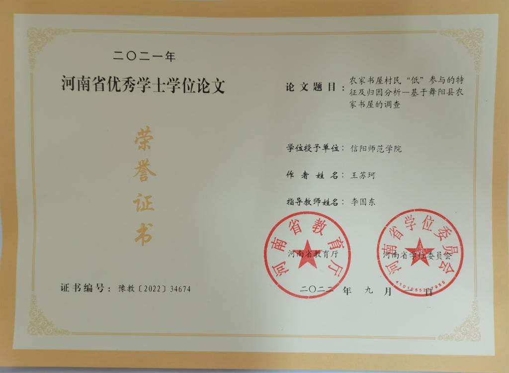 第一篇是历史学专业杨俊雅同学所写的《从女弹词看近代苏沪女性地位的提高》,该论文由尹全海教授指导;第二篇是文化产业管理专业王苏珂同学所写的《农家书屋村民“低”参与的特征及归因分析—基于舞阳县农家书屋的调查》,该论文由李国东博士指导。