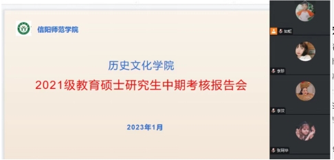 2023年1月7日,我院以腾讯会议的形式举行了2021级教育硕士研究生中期考核报告会。会议由史经霞主持,叶宗宝、孙炜、李志坚、姚磊、张乐锋、连先用等导师参会,该专业全体在读研究生列会学习。