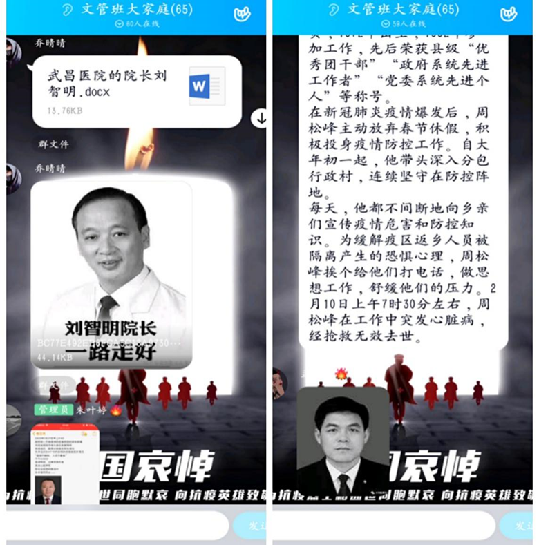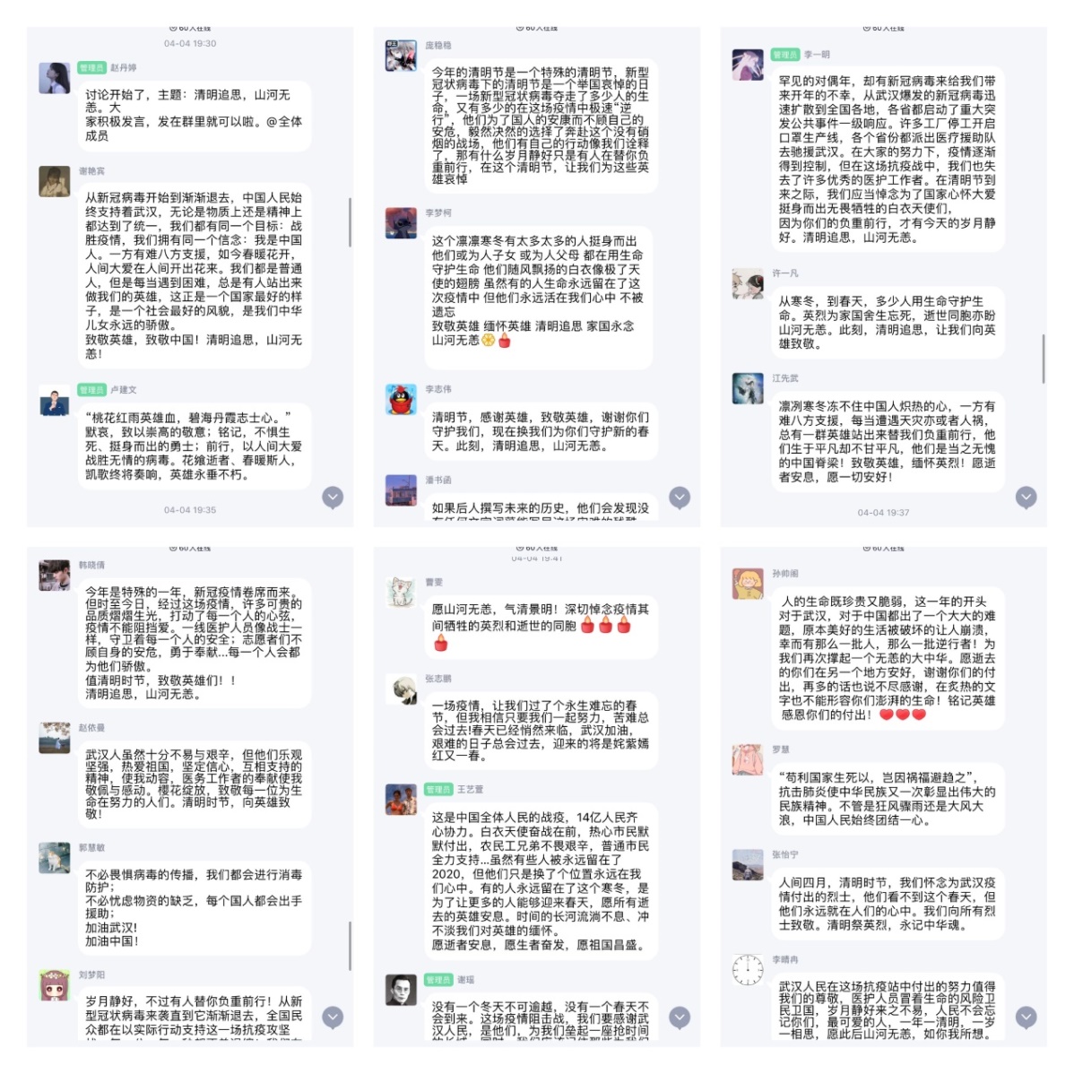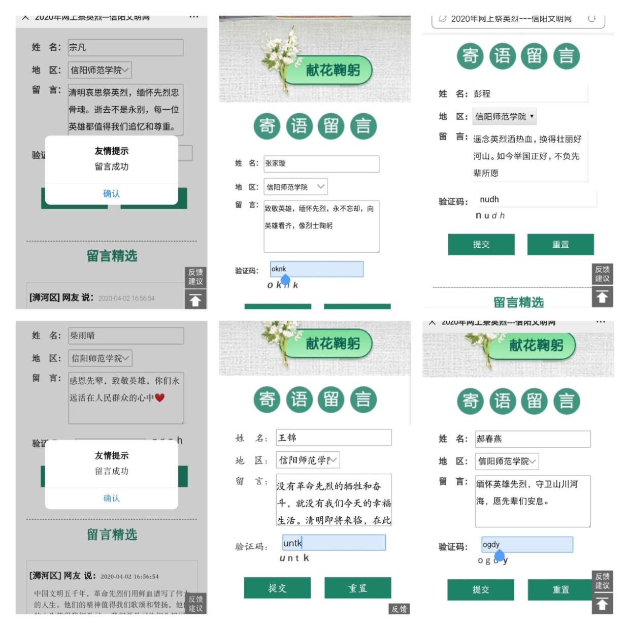 利用线上主题班会和主题团课形式,同学们通过指尖传递敬意,送上怀念和追思,以表达对抗击新冠肺炎疫情斗争牺牲烈士和逝世同胞的深切哀悼;利用学生支部主题党日活动,号召同学们登录中华英烈网和信阳文明网等网站,向英雄烈士鞠躬献花,表达对先烈的崇敬之心、感念之情、传承之志,抒发追忆革命先烈、铭记革命传统、弘扬爱国精神的感言。