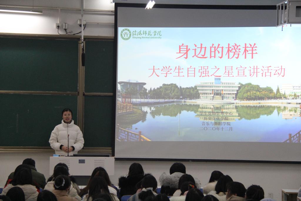 12月16日晚,我院于社科楼212教室举办“身边的榜样”—大学生自强之星宣讲活动。传媒学院“国家奖学金”获得者张润嘉、马克思主义学院“自强之星”贾雨晴及文学院“自强之星”李国栋向我院2019级、2020级学生分享他们的成长故事。本次活动由我院资助专员付亚男主持。