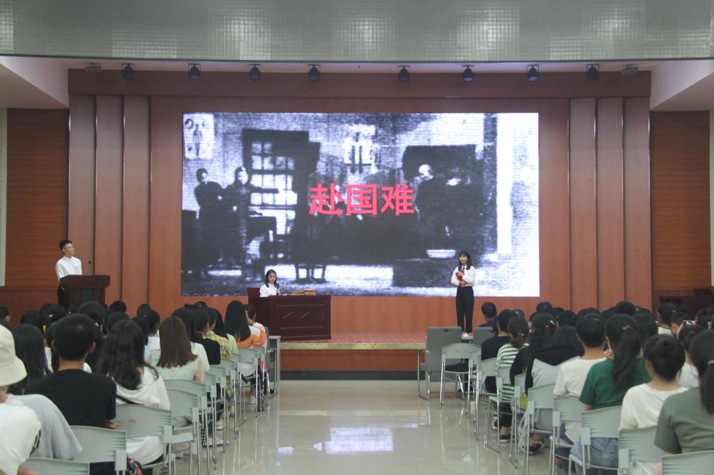 杨傲龙同学讲述了戏剧大师黄佐临在七七事变后,辞别老师萧伯纳与妻子回国共赴国难的故事;李炅和吴晓桐同学分别讲述爱国大将徐海东和巾帼英雄赵一曼的革命事迹,让同学们体会到新中国是无数革命志士征战疆场、奋勇杀敌建立起来的;孙美晨带领在场师生回顾了开国大典的盛况,并讲述了当五星红旗已经升起时红岩渣滓洞里革命烈士的故事;杨晓波讲述了两弹元勋邓稼先的感人事迹,刘双老师真情讲述了身边的四有好老师——“摩托导师”武崇申去家访的故事;宋添姿同学通过1919巴黎和会和习近平主席访问巴黎为对比,见证了中国崛起的百年征程。活动在歌曲《我和我的祖国》中落下帷幕。