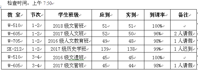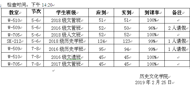 为进一步规范教学管理,维护正常教学秩序,确保教学工作顺利开展,2019年2月25日,我院教学自查小组对上课班级师生到课情况进行了检查,现通报如下:
